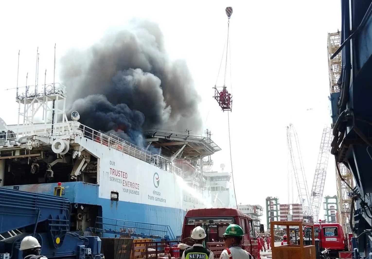 Kepulan asap hitam pekat terlihat membumbung tinggi dari area operasional perusahaan, sebagaimana terekam dalam pantauan di lokasi kejadian. Tim pemadam kebakaran segera dikerahkan untuk memitigasi api agar tidak merambat ke unit kapal lainnya.