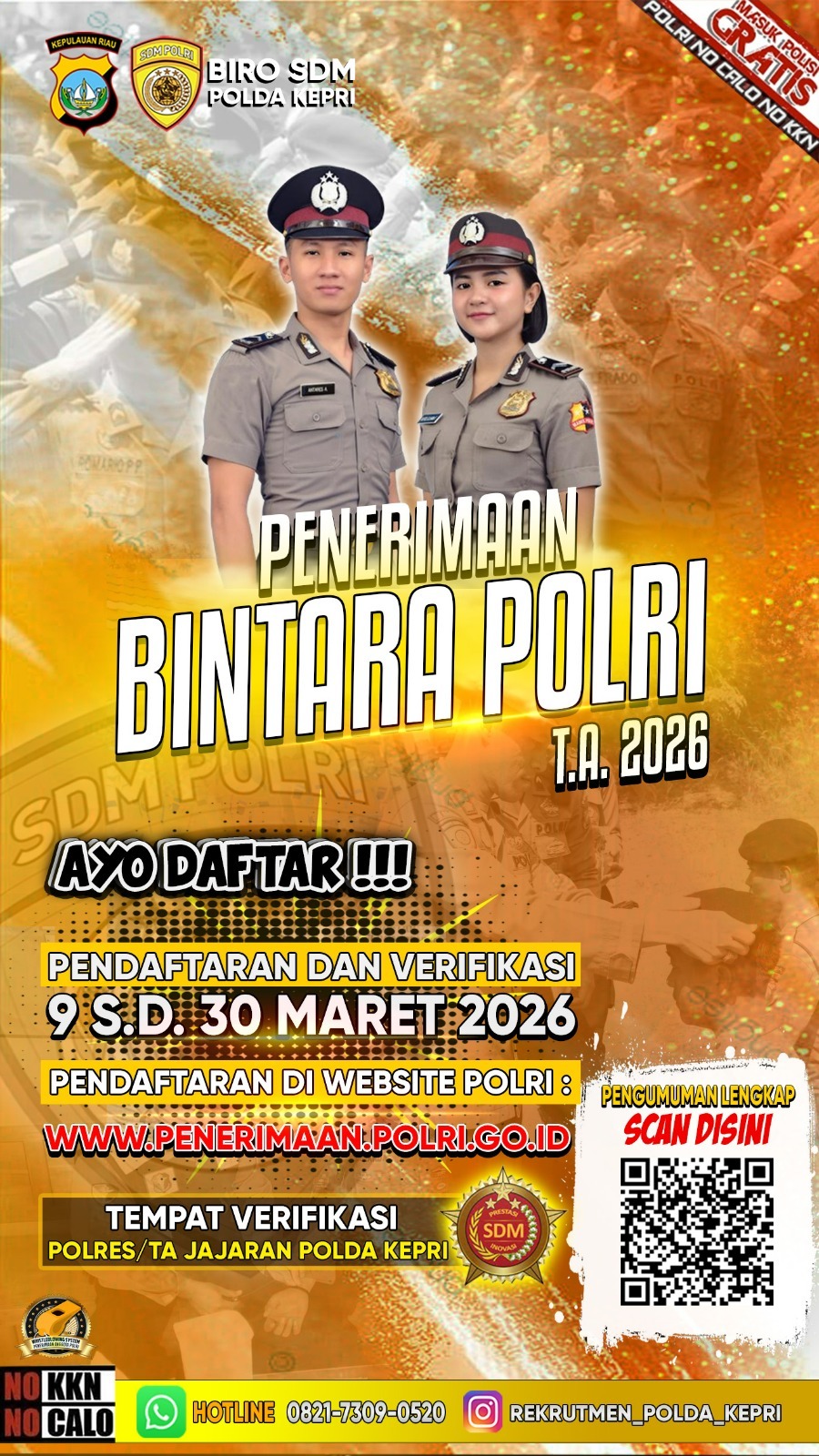 RealBatam.com,Batam-Kepolisian Daerah Kepulauan Riau mengajak putra-putri terbaik di wilayah Kepulauan Riau untuk bergabung menjadi anggota Polri melalui Penerimaan Terpadu Anggota Polri Tahun Anggaran 2026 yang meliputi jalur Taruna Akademi Kepolisian (Akpol), Bintara Polri, dan Tamtama Polri.