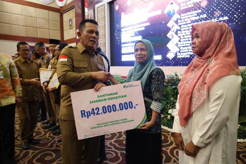 Gubernur Kepri Ansar Ahmad menyerahkan santunan jaminan kematian ke ahli waris. (Foto: Dok BPJS Ketenagakerjaan)