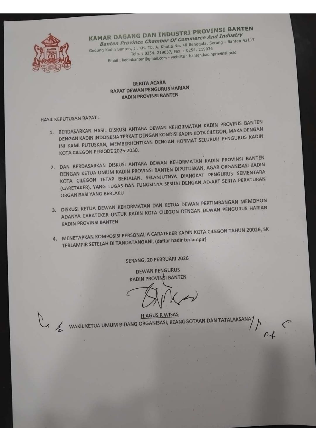 RealBatam.com, Cilegon – Pasca melaksanakan Rapat Pengurus Lengkap (RPL) yang diselenggarakan 14 Februari 2026 lalu, Pengurus Kamar Dagang Industri (KADIN) Kota Cilegon resmi diberhentikan.