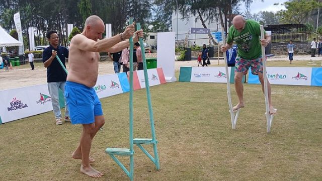 Wisatawan mancanegara asal London-Inggris memainkan permainan rakyat egrang di sela kegiatan Bintan Jong Race Festival 2026 di Bintan Resorts, Bintan, Kepulauan Riau.